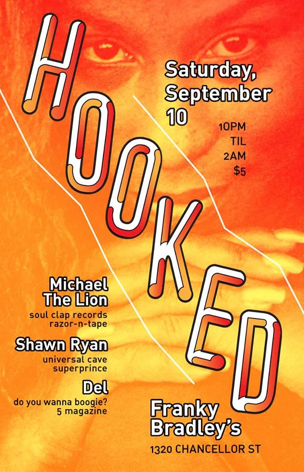 I am so down with DJs Michael The Lion, Shawn Ryan and Del's vibe for Hooked — loosely billed as "disco classics and the music they inspired" but as you can hear, it's so much more specific than that — that I want to make my own iron-on t-shirts for it or just start tagging elliptical references to the vibe all over town. What will they say? Here's a few tries: